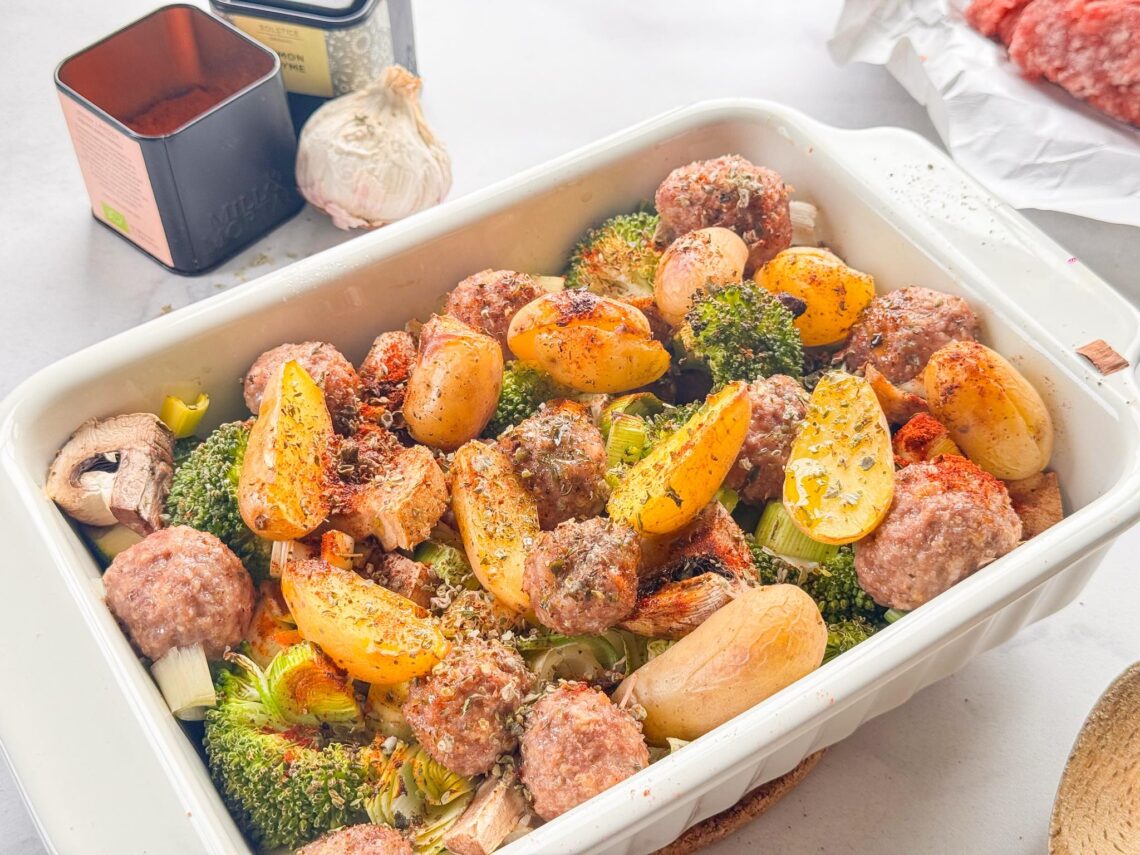 Ovenschotel met gehaktballetjes, krieltjes en groenten (traybake)