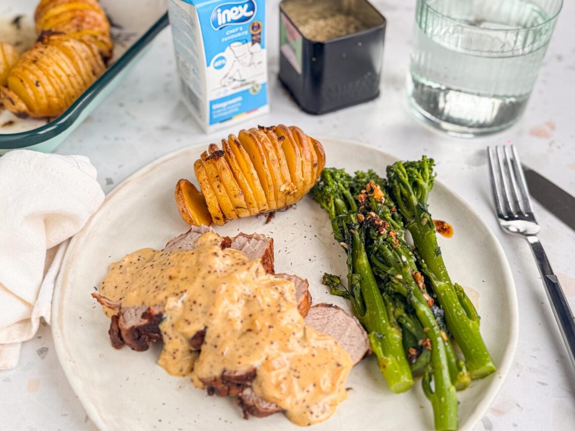 Varkenshaasje met romige mosterdsaus, Hasselback-aardappelen & sweet & spicy bimi’s