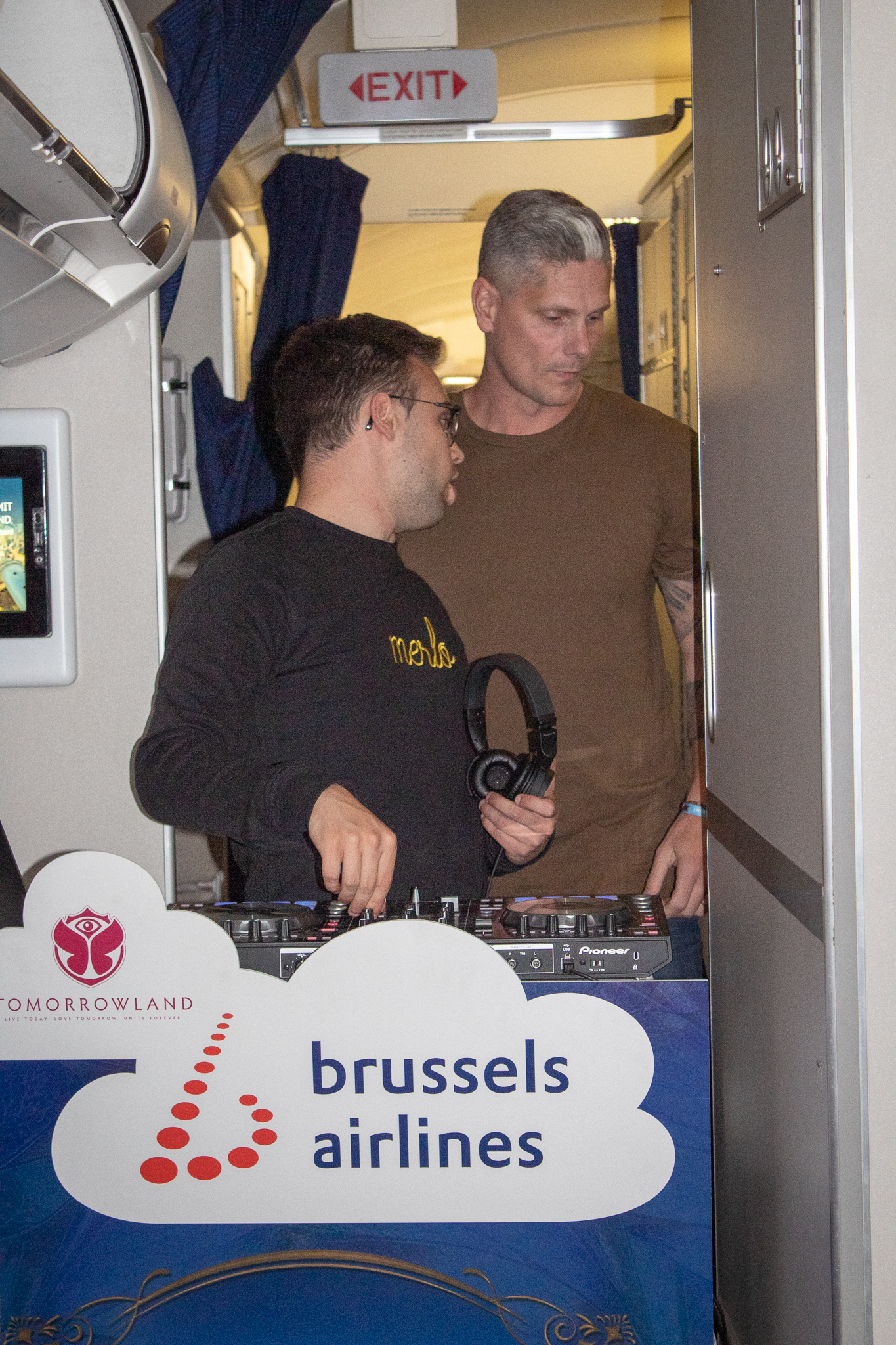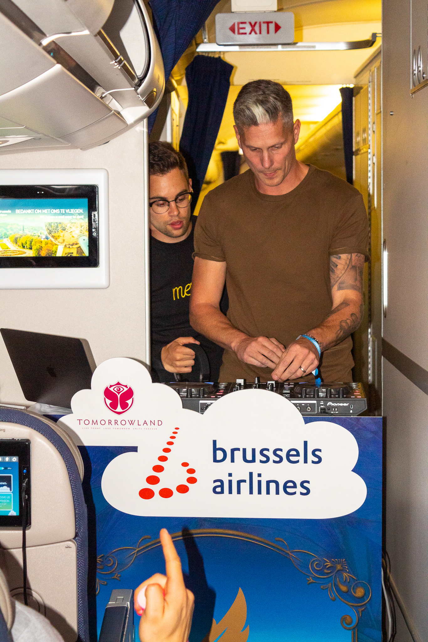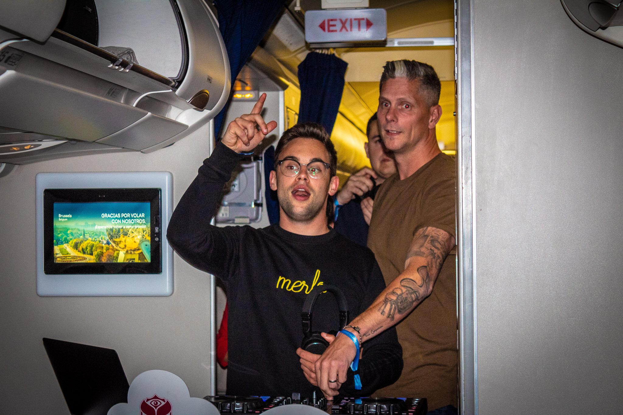 12u00: tijd om te boarden en ons klaar te maken voor een feestje in de lucht. Ik heb al veel meegemaakt maar nog nooit kunnen genieten van een DJ set in de lucht. Iedereen kreeg lichtgevende buizen, een krant van Tomorrowland en dan moesten we nog wachten op 1 ding en dat was als we hoog genoeg in de lucht hingen het sein van dat de veiligheidsgordels af mochten. DiMaro & Merlo stonden recht en amper 2 minuten later was iedereen gewoon kei hard (zittend) aan het dansen! De sfeer zat er zo goed in! Iedereen had gewoon zin in 4 dagen Madness in Boom! De passagiers, de crew, de dj’s en wij als “pers” genoten van deze unieke gebeurtenis! Ik wist dat ik door mijn blog me in een zo bevoorrechte postitie aan het bevinden was want geef toe, er zullen weinig Belgen dezelfde unieke experience kunnen meemaken als ik!